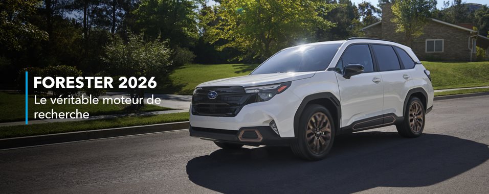 La Subaru Forester 2026 – sixième génération de notre populaire VUS compact hors du commun – est plus polyvalente, plus sécuritaire, plus élégante et plus généreusement équipée que jamais. Fruit d’une conception entièrement renouvelée, cette Forester présente une silhouette musclée, un habitacle raffiné ainsi qu’une conduite plus silencieuse et confortable. L’équipement de série inclut la plus récente mouture du système primé Subaru EyeSight®, qui intègre une monocaméra grand angle pour une meilleure protection précollision des piétons et des cyclistes. Au nombre des équipements livrables en option, notons l’écran d’infodivertissement de 11,6 po, le hayon à commande électrique mains libres avec capteur de mouvement de pied**, le tapis de recharge sans fil et l’intégration des fonctionnalités Apple CarPlayMD et Android AutoMC sans fil. Pour une expérience de conduite sportive et élégante, il y a la Forester Sport qui se distingue par ses éléments de conception uniques et sa suspension sportive, assurant un meilleur contrôle. Quelle que soit la version de la Forester choisie, vous aurez en main un VUS familial ultra sécuritaire et paré pour l’aventure.